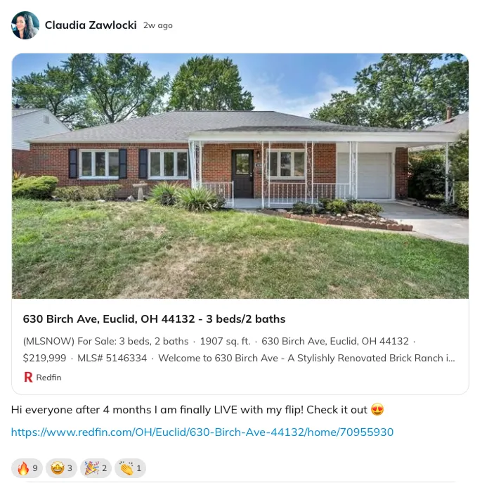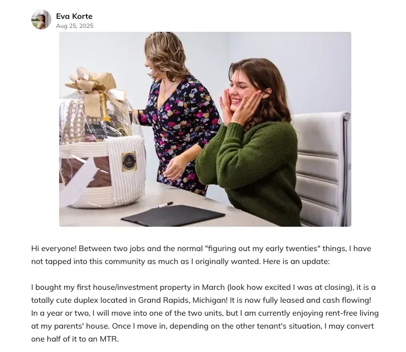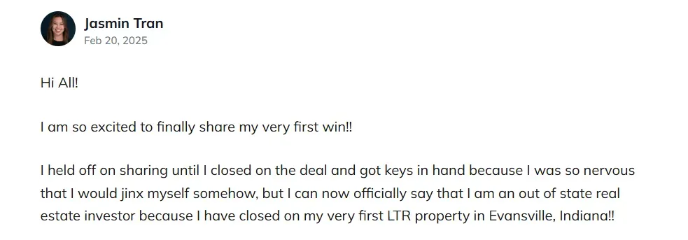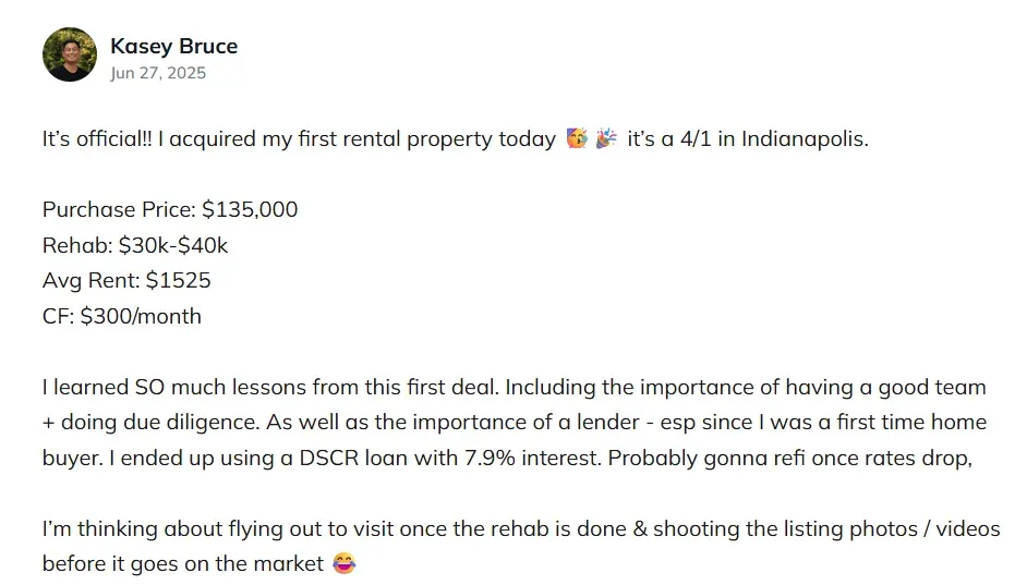 "If you've been looking for that community of people to push forward and if you're stuck in analysis paralysis like I was, this is the perfect place to start. I didn't know anything, I had zero experience, but now I'm officially an investor and onto my next real estate goals!"